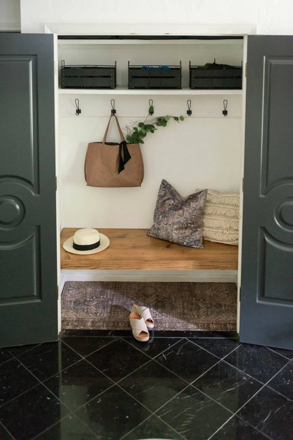 If you don’t have a lot of coats that need closet space, then consider converting an entry closet to a more attractive space. Ashley added a bench, hooks, small area rug, and some baskets to make this a super stylish place to hang your bags.